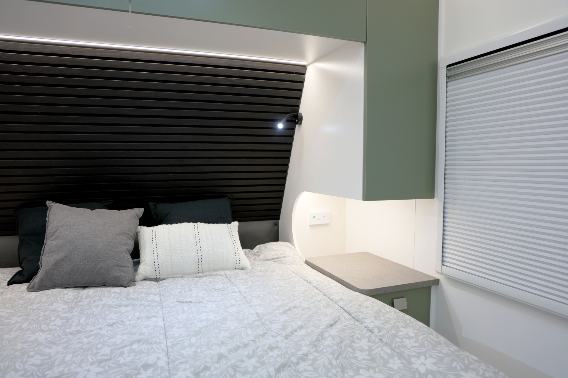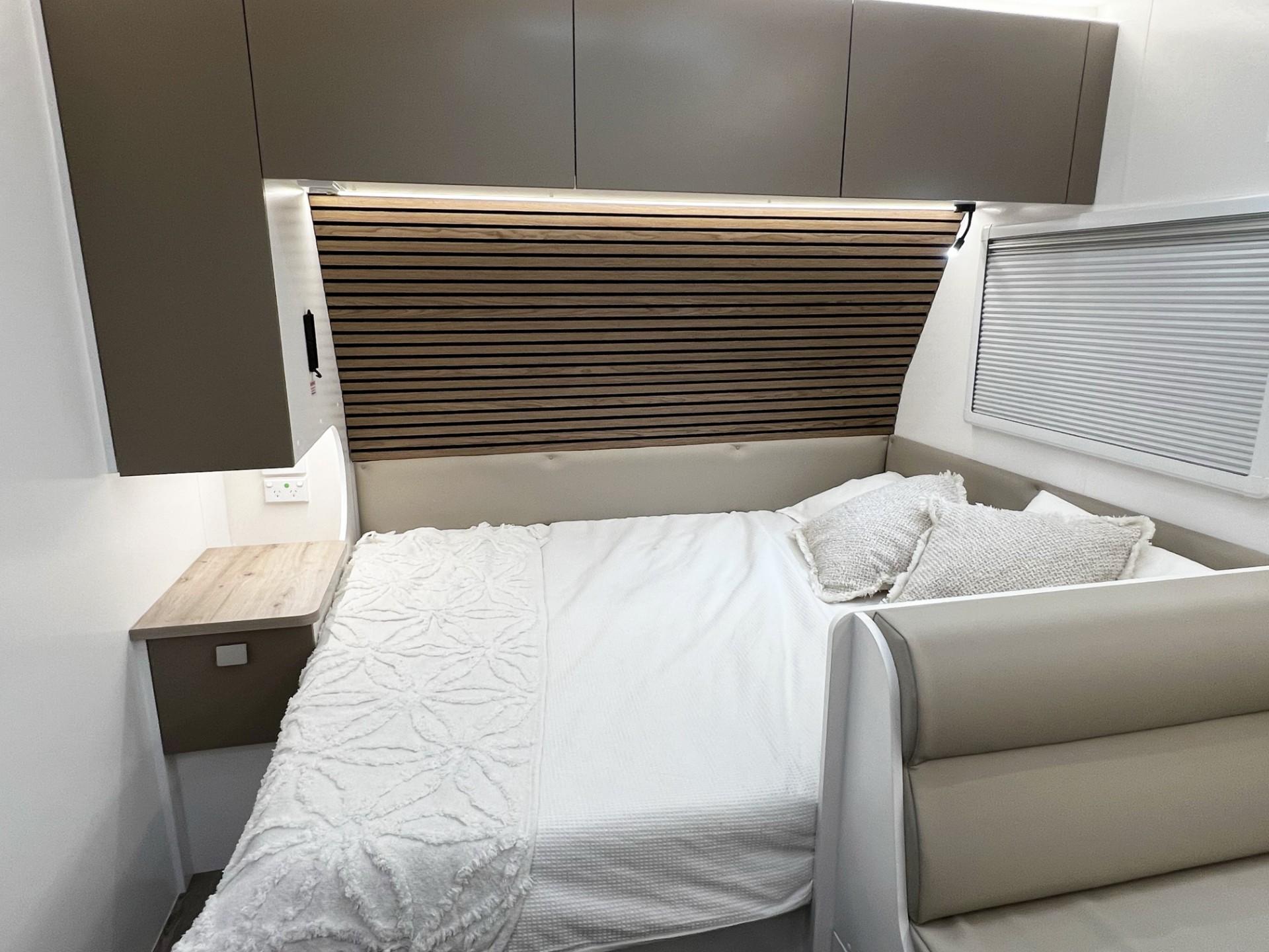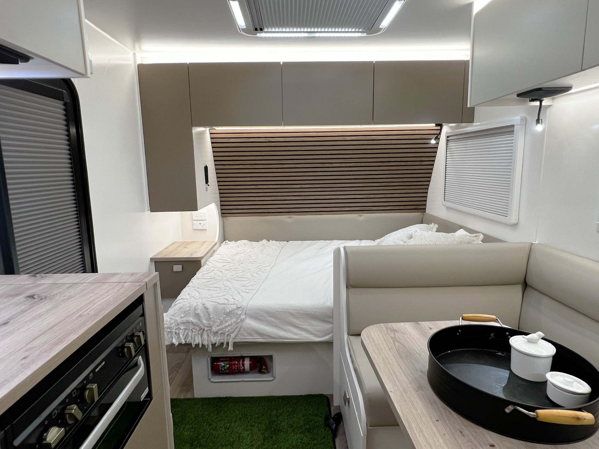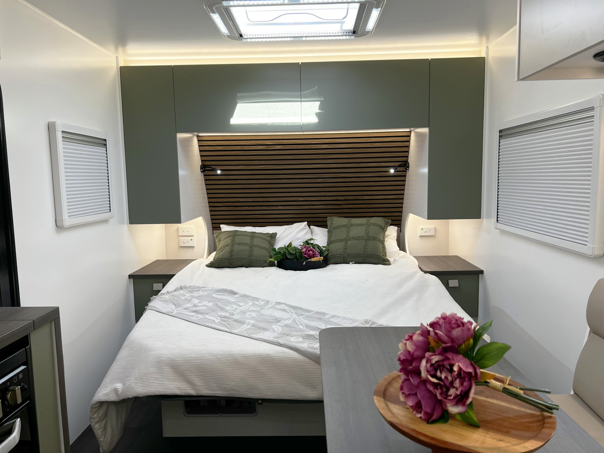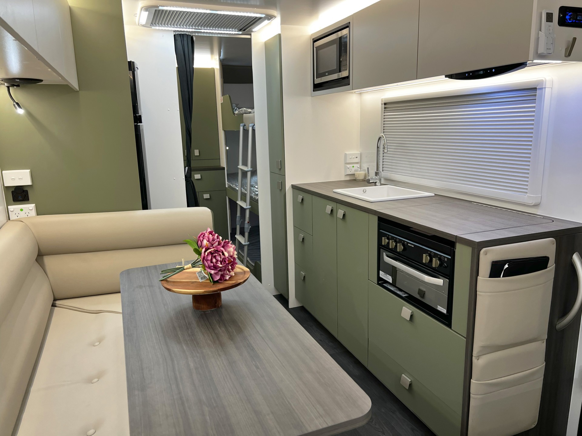 The new model features a bunk bed setup, a curved robe, thicker 25mm benchtops, and a repositioned kitchen for improved flow and usability. The toilet has been relocated to maximise interior space, while USB-C charging, a modern single-bowl sink, and acoustic wall panels enhance convenience and comfort for parents and kids alike.