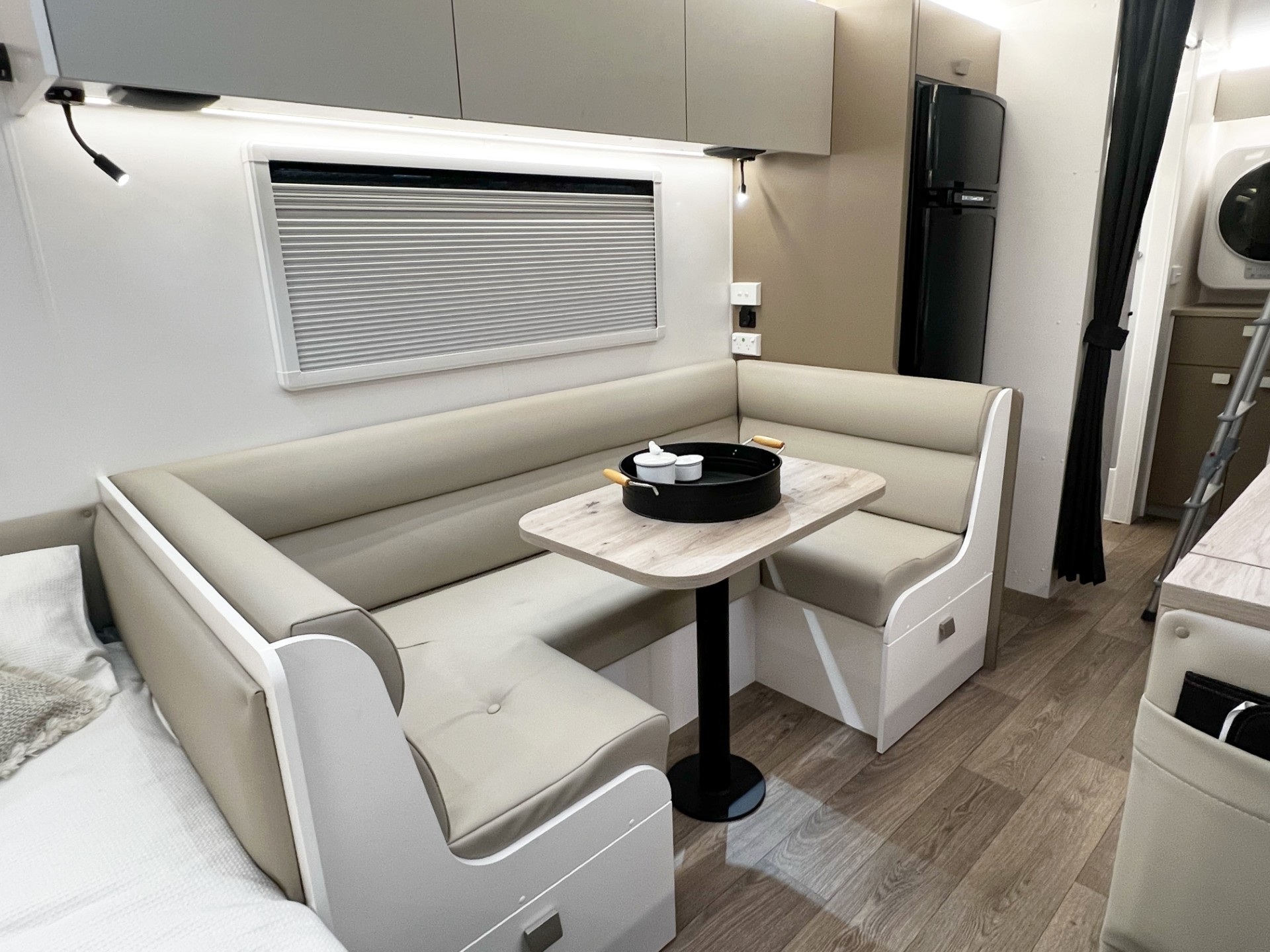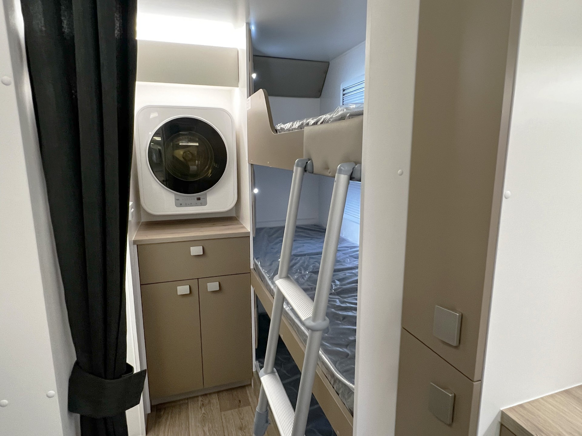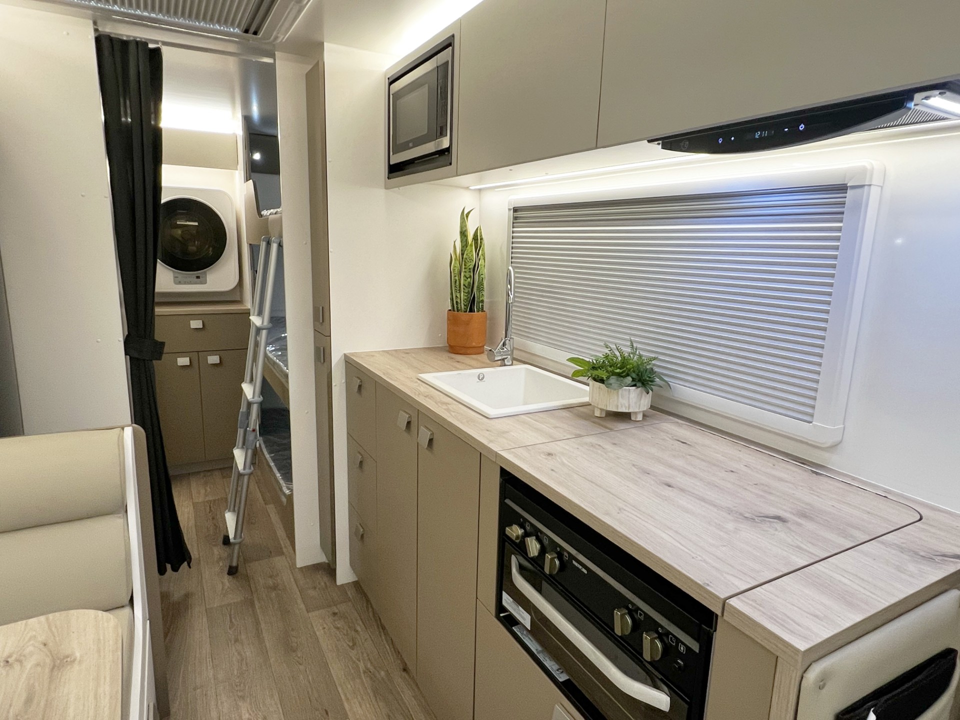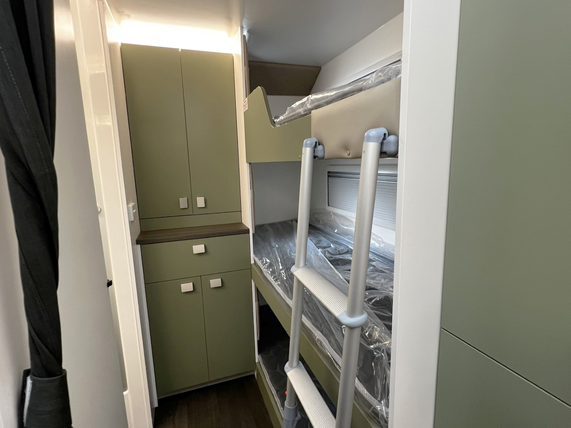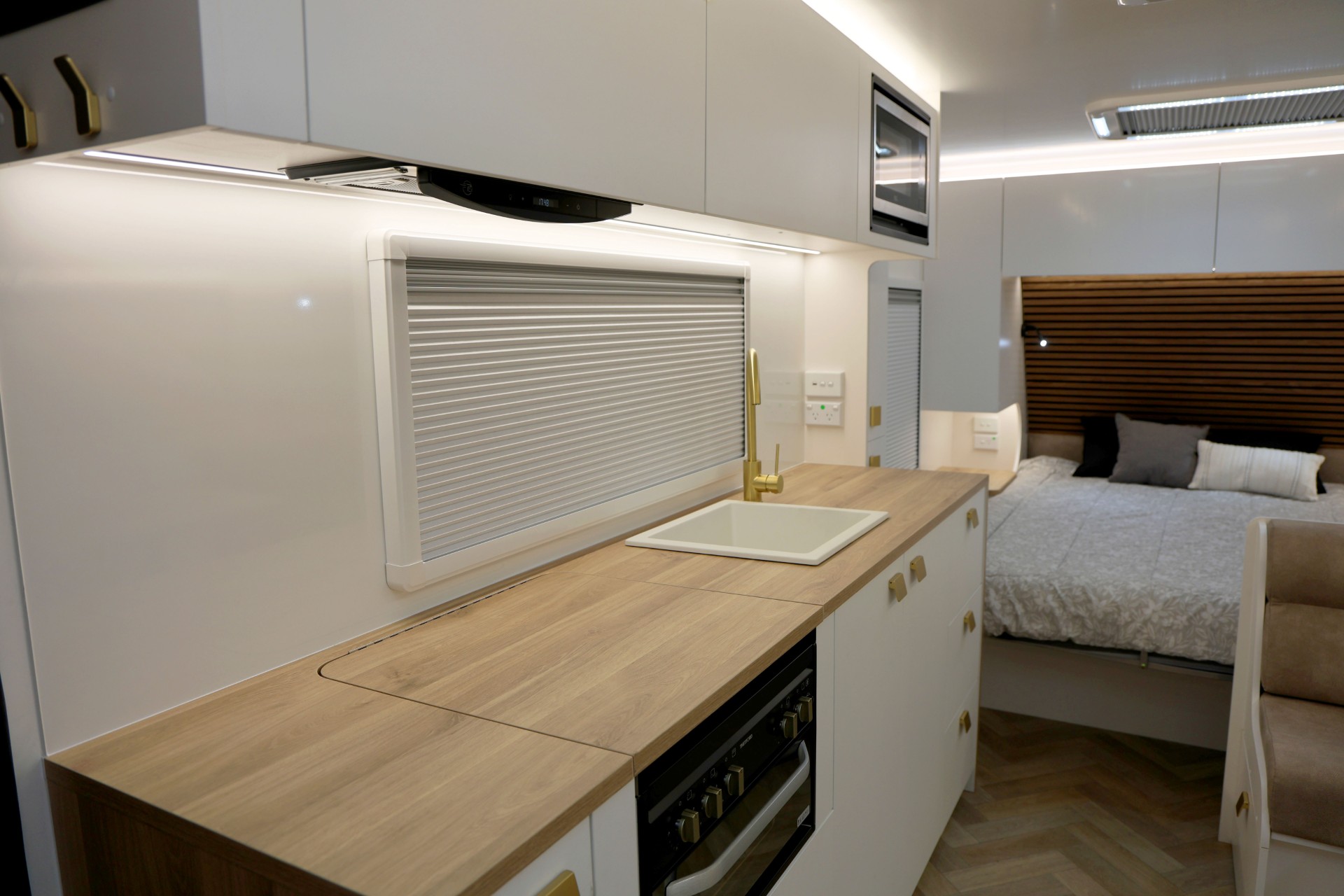 The new model features a bunk bed setup, a curved robe, thicker 25mm benchtops, and a repositioned kitchen for improved flow and usability. The toilet has been relocated to maximise interior space, while USB-C charging, a modern single-bowl sink, and acoustic wall panels enhance convenience and comfort for parents and kids alike.