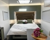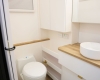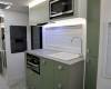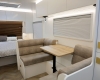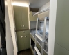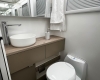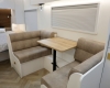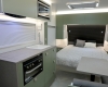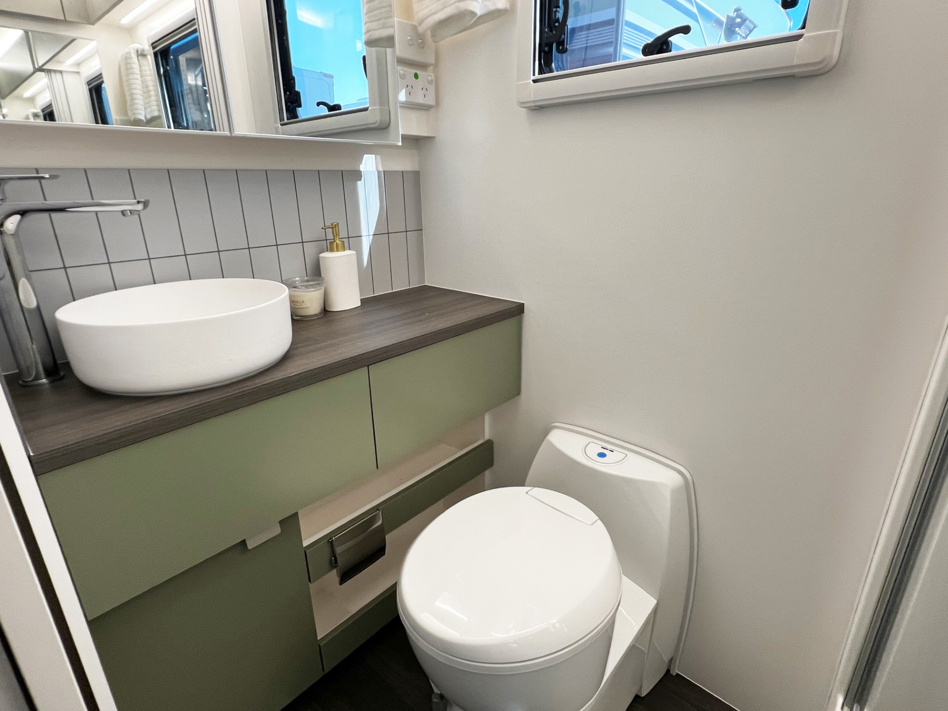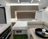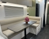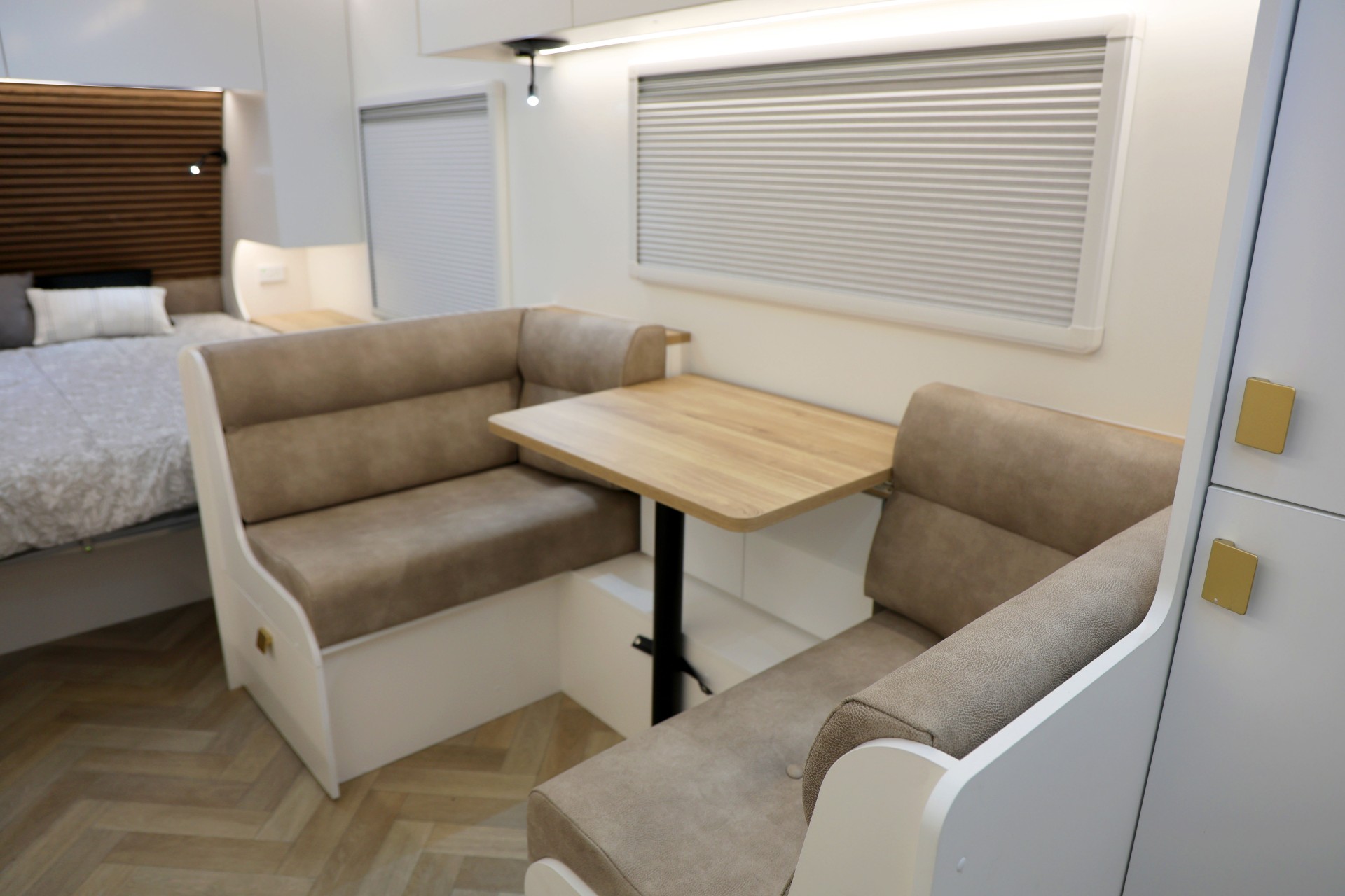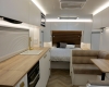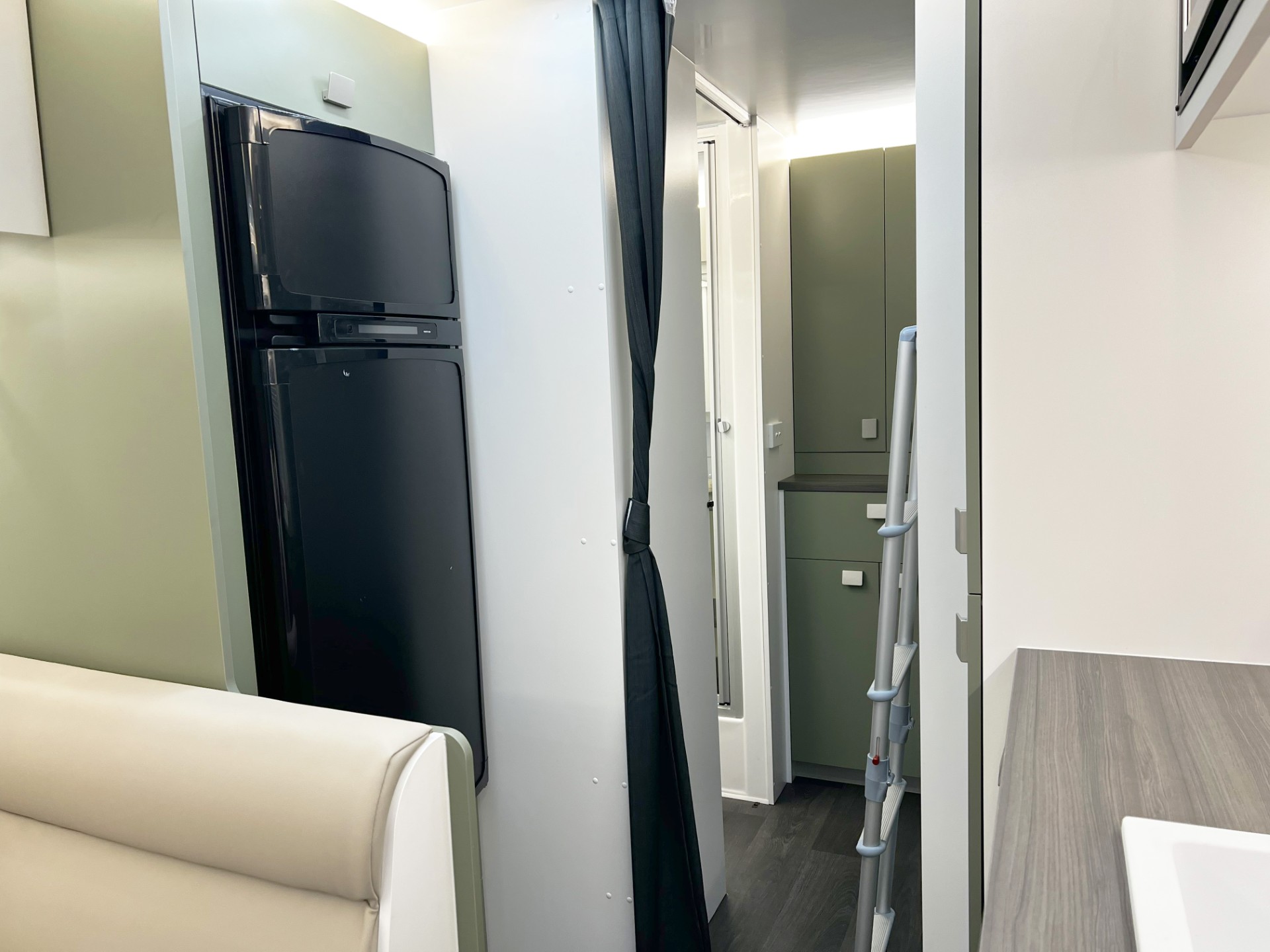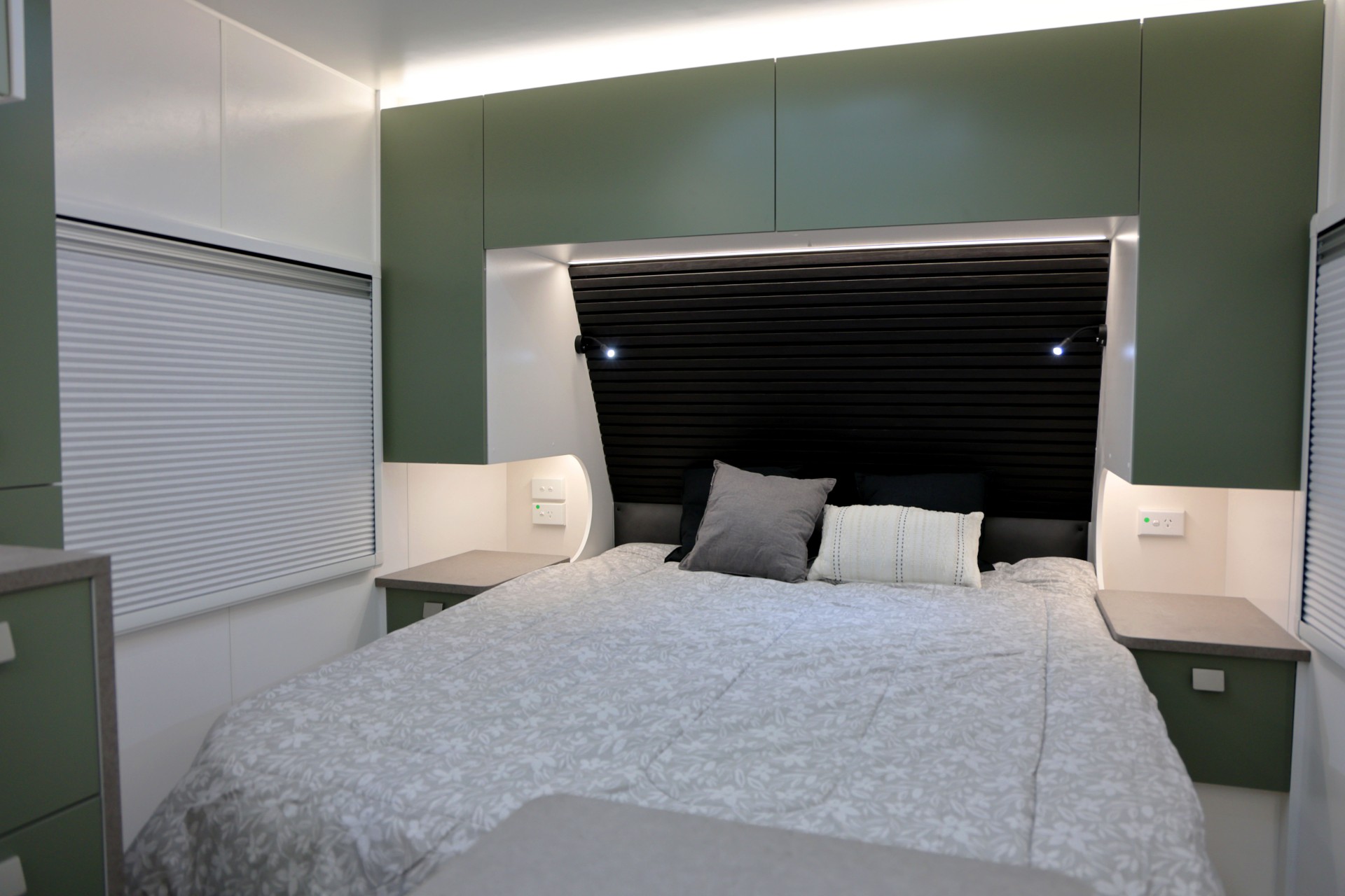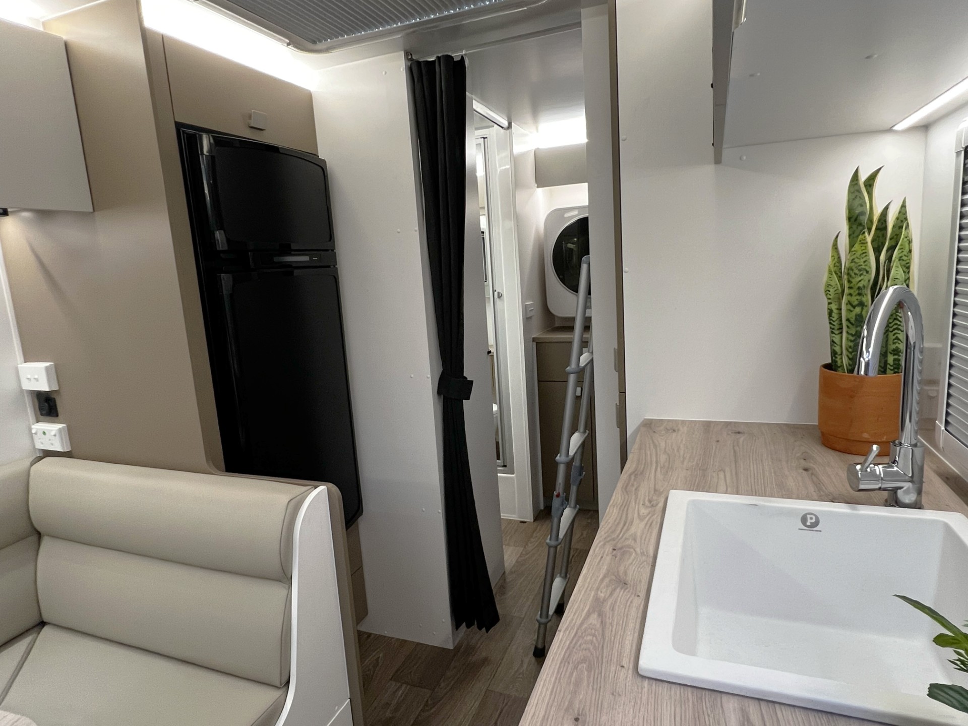 The new model features a bunk bed setup, a curved robe, thicker 25mm benchtops, and a repositioned kitchen for improved flow and usability. The toilet has been relocated to maximise interior space, while USB-C charging, a modern single-bowl sink, and acoustic wall panels enhance convenience and comfort for parents and kids alike.